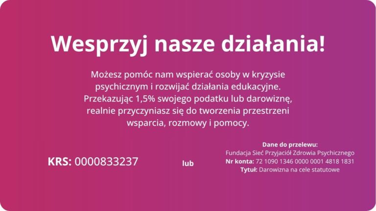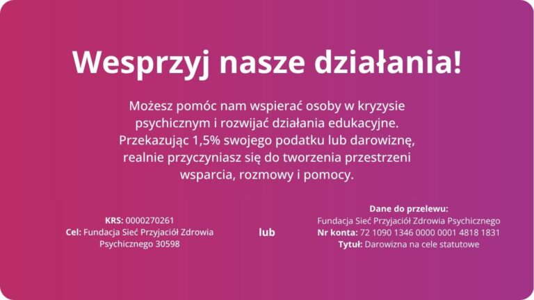 Sieć Przyjaciół Zdrowia Psychicznego to Fundacja, która ma na celu zapewnienie niezbędnego wsparcia każdej osobie zmagającej się z problemami zdrowia psychicznego, tj. każda osoba, która kiedykolwiek czuła się odizolowana, niezrozumiana, bądź napiętnowana chorobą. W związku z powyższym, powołano do życia Sieć Przyjaciół Zdrowia Psychicznego, w której to młodzi ludzie nawzajem się wspierają.